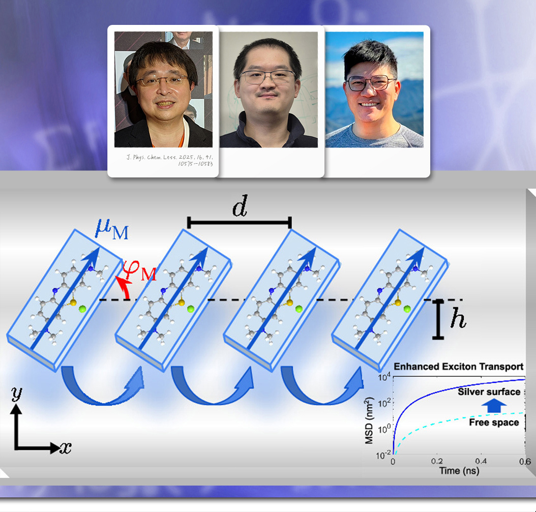 本研究採用宏觀量子電動力學 (macroscopic quantum electrodynamics) 框架,模擬特殊角排列的亞甲基藍分子聚集體在銀金屬表面附近的激子傳輸過程,發現激子傳輸被顯著加速。定量上,激子均方速度 ( ⟨v2⟩ ) 獲得了相對真空環境高達三個數量級的增強,且在分子-銀表面間距 (h)、分子間距離 (d) 和分子躍遷頻率 (ωM) 的廣泛變化範圍內,這種增強保持得都相當明顯。利用鏡像偶極近似,我們推導出均方速度的增強因子相對於這些參數的冪次方成關係 (power-law scaling):∼ h–2.5、∼ d–2 和 。透過分析這項近似關係,我們發現激子擴散加速源自於金屬表面引起的輻射散射 (radiative scattering) ,因此突破傳統激子傳輸理論的限制,展現出藉由介電環境操控激子傳輸的潛力。此研究成果由中研院原分所許良彥研究員與美國聖母大學(University of Notre Dame)陳信達教授團隊跨國合作完成。陳信達教授畢業於國立臺灣大學,目前任教於聖母大學,其團隊致力於強光物質交互作用中化學與材料性質的理論計算。