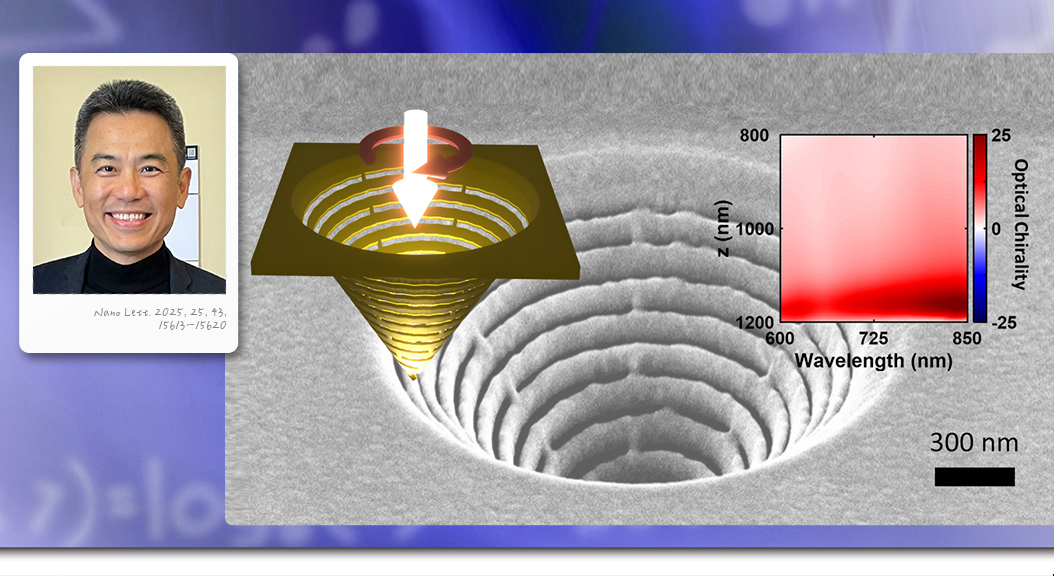 手性分子(chiral molecules)的化學組成相同但三維結構具鏡像差異,在生物化學、材料科學及醫藥科學中至關重要。正確手性可發揮功能,錯誤手性則能造成嚴重危害,歷史上沙利竇邁(Thalidomide)事件即因分子手性差異導致新生兒畸形,所以精確分析手性分子非常重要。光學手性分析方法中,最常使用圓二色(circular dichroism)光譜術。其原理是以圓偏振光照射手性分子,再量測分子對左旋與右旋光吸收度的”差異”,將差異對波長作圖,即得圓二色光譜。然而,因為分子尺寸(10⁻¹⁰–10⁻⁹ m)與光波長(10⁻⁷–10⁻⁶ m)差距過大,故手性造成的吸收差異極小,一般不到總體吸收度十萬分之一(<10⁻⁵)。因此,如何提升 CD 靈敏度,是科學界挑戰。本研究提出三維電漿阿基米德螺旋奈米結構,於線偏振光激發下,能在腔體內側產生具有寬頻光學手性(optical chirality)的光近場熱區,使手性分子進入後 圓二色訊號增強達 25 倍。此結構本身兼具奈米粒子篩的功能,因此可結合奈米小球固相微萃取術,將手性分析物預濃縮於小球表面,並捕捉進熱區進行檢測。此策略突破傳統奈米結構頻寬小、手性翻轉、空間侷限及分子難以進入熱區等困難,能顯著提升光手性分析靈敏度,為奈米結構在光學手性檢測之應用上開創新方向。