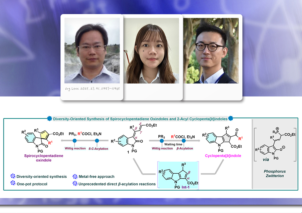 螺環噁吲哚 (spirocyclic oxindoles) 與環戊二烯并吲哚 (cyclopenta[b]indoles) 是眾多生物活性天然物的重要骨架。然而,現有研究大多需使用過渡金屬催化劑並使用特定發展成熟的反應物 (如異靛紅衍生的 MBH 碳酸酯或 3-硝基吲哚) 來進行合成。要從單一新型反應物出發,透過「多樣性導向合成」(DOS) 策略,精準調控並分別製備這兩種結構迥異的分子,是當前合成化學上的一大挑戰。