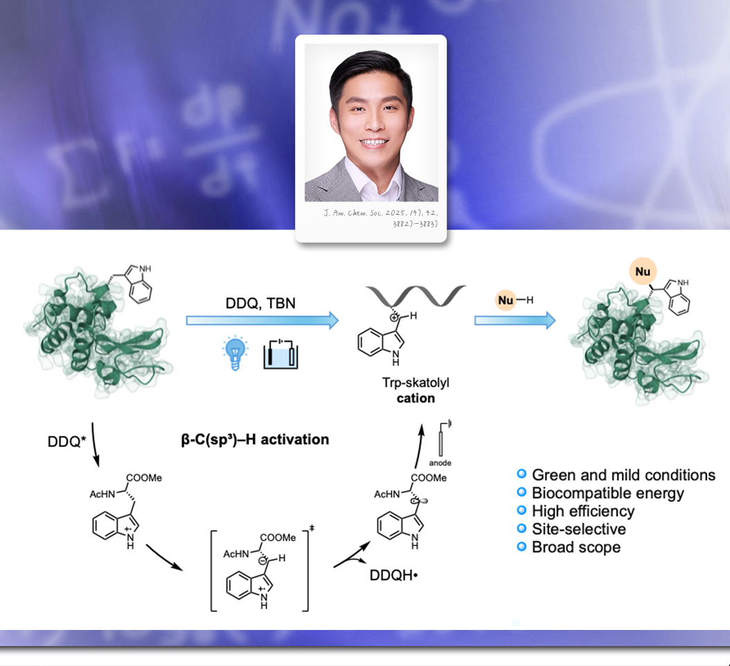 胺基酸與蛋白質的選擇性化學修飾,是生物分子工程與精準藥物設計的核心方向。然而,多數反應僅能在既有官能團或吲哚環表面進行,限制了功能化的多樣性,也可能改變蛋白質的天然構形與活性。本研究提出一項全新光電催化(photoelectrocatalysis)平台,能在溫和的條件下,高選擇性地活化色胺酸(Trp)β-位的 C(sp³)–H 鍵,並直接導入親核試劑以形成穩定的 C–N 鍵結構,成功突破以往生物共軛反應侷限於吲哚 C2/C3 位修飾的困境。