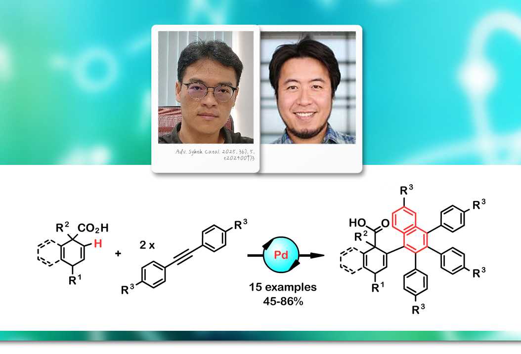 本研究開發一種新穎的鈀催化氧化環化反應,利用未修飾的羧酸官能基作為導向基團,實現對於C(alkenyl)−H鍵的雙連續活化與1,2-二芳基乙炔插入,進而有效建構多取代之萘環化合物。此催化系統無需額外配體,且與傳統需額外安裝導向基的系統相比,此反應機制依賴羧酸基團的弱配位能力,有效簡化合成步驟並提升操作效率。反應過程中,第二次炔插入發生於經由首次炔插入所形成的中間體芳香環上,並藉由罕見的1,4-Pd 遷移機制完成,此為C−H活化/炔插入反應中較少觀察到的現象。為進一步闡明反應機制,我們進行了包括動力學同位素效應(KIE)實驗、控制實驗以及密度泛函理論(DFT)計算在內的詳細機構研究。結果指出,初始的C(alkenyl)−H活化步驟為可逆且為速率決定步驟,而1,4-Pd遷移與第二次炔插入步驟密切相關,並對產物選擇性具有關鍵影響。此外,此策略展現了對多種取代基反應物的良好耐受性與官能基兼容性,反應條件操作簡便且具規模放大潛力,對於設計具功能性之多環芳香化合物提供了高效而實用的合成手段。總結而言,本研究不僅展示一種以羧酸導向、無配體參與的雙C−H活化/炔插入策略選項,也提供一條具操作簡便性與機制創新的芳香骨架構築途徑,對有機合成與功能材料化學領域皆具高度參考價值。