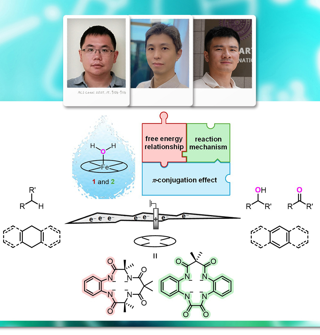 錳、鐵、鈷、鎳與銅等第一列過渡金屬,因地殼中的豐富儲量及具潛力的催化效能,近年逐漸成為電化學分子催化研究的焦點。本研究將不同π共軛結構的四醯胺大環配位基鐵錯合物 1 和 2 製備成分子催化劑,以研究配位基在電化學 C(sp3)−H 氧化反應效率的影響。由於 2 的配位基具有更高的π共軛結構,因此相對於1能夠在較低的電位下達到更高的氧化態。我們藉由反應速率常數的對數與有機反應物的 C(sp3)−H 鍵解離能間的關係評估兩者的電化學催化性能,自由能的線性分析發現 2 的斜率明顯低於 1 ,顯示其反應速率常數較不受有機反應物C(sp3)−H 鍵解離能的影響。該結果指出具有較高π共軛度的配位基,因高價態的Fe-oxo催化活性物種較穩定且親電性較弱,使其反應速率在不同有機反應物間的差異相對較小。我們的研究團隊藉由電化學、低溫電噴灑質譜、低溫紫外光光譜法等實驗及密度泛函理論計算驗證 1 和 2 的反應中間體結構,進而推測可能的催化機制。本研究明確指出,藉由改變配位基結構可直接改變反應路徑,調節鐵分子催化劑在電化學 C(sp3)−H 氧化反應的催化活性。此領域未來的研究重點將聚焦於修飾第一配位層和第二配位層的分子結構以最佳化電催化劑,以提高有機分子利用和潔淨能源轉化的反應性與選擇性。
