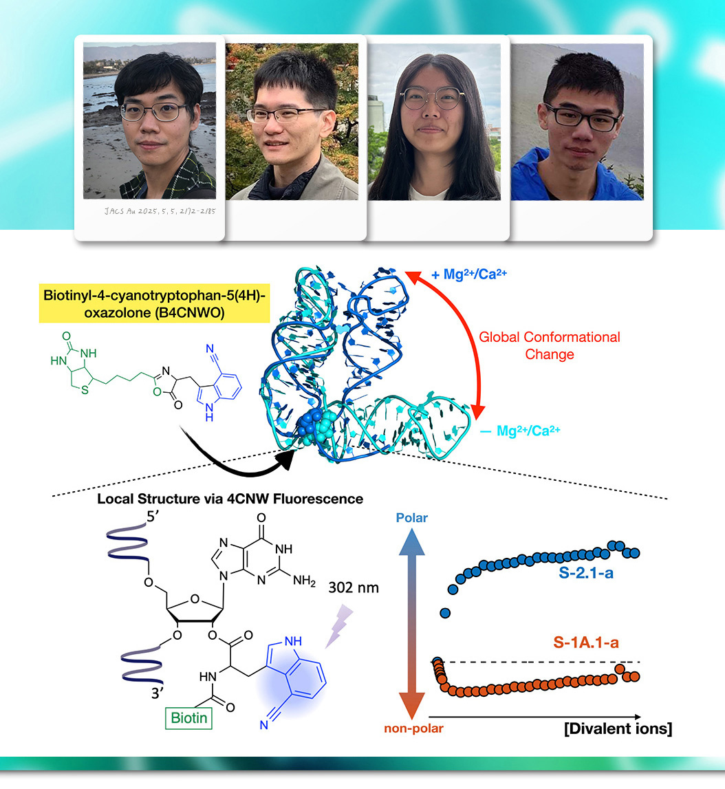 本研究成果的關鍵螢光探針分子由已畢業的楊甯鈞同學建立合成步驟,後續化學光譜與生化實驗由博士生鄭育凱與大學部專題生初幸惠共同完成。這項研究不僅深入揭示RNA酵素的催化機制,也為探索生命起源與RNA功能演化提供全新視角。