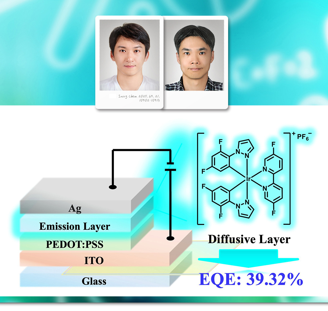 發光電化學元件(light-emitting electrochemical cells, LECs)是一種具成本效益的照明技術,因其製程簡單、適用於大面積印刷製造,而被視為未來照明與顯示應用的重要選項。然而,LECs 的效率仍有明顯進步空間,是目前研究的關鍵挑戰之一。本研究設計並合成了一系列具有藍綠色磷光特性的銥金屬錯合物,旨在提升元件的發光效率。其中,一種名為「二[1-(2,4-二氟苯基)-吡唑基]-5,5’-二氟-2,2’-聯吡啶銥(III)六氟磷酸鹽」的化合物表現最為出色。經過元件結構最佳化(特別是主動層厚度的調整)後,成功達成 16.8% 的最大外部量子效率(external quantum efficiency, EQE)以及 47.2 cd A-1 的電流效率。本研究團隊更進一步在元件中引入一層擴散層,有效萃取出侷限於基板內的光,使效率大幅增強。最終成果 EQE 高達 39.3%、電流效率 109.6 cd A-1,相較初始元件提升了 270%。這項研究不僅展示了磷光錯合物在 LECs 中的應用潛力,也提供了提升效率的可行策略,為未來開發高性能、低成本的電致發光元件奠定了技術基礎。
