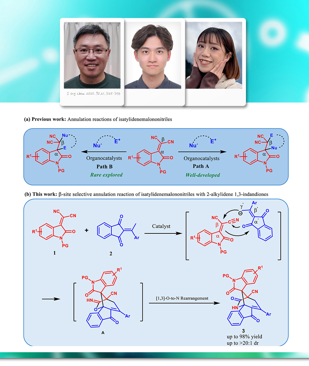 本實驗室致力於開發有機小分子催化反應,而該研究是以奎寧(quinine)作為有機小分子催化劑,成功實現了2-乙烯基-1,3-茚二酮(2-ethylidene-1,3-indandiones)與異靛基丙二腈(isatylidene-malononitriles)之間的有機催化級聯反應。該反應除了可在相當溫和的條件下即可得到相當不錯的產率之外,亦提供了一高效的合成方式可在一步反應下可使異靛基丙二腈在β位置上進行非預期的插烯Michael加成,隨後經歷了醛醇環化、烷氧基對腈基的1,2-加成,以及[1,3]-氧到氮的重排,最終生成了含有醯胺、茚酮和靛酮等具有生物活性之結構單元且具有獨特螺環橋接雜環化合物。在產率方面表現良好至優異,且具有很高的非對映選擇性。我們利用控制組實驗驗證該反應中重排反應之過程,亦透過理論計算驗證該反應之區域選擇性。同時我們也利用了理論計算得到推測反應機構之反應能量圖並驗證了此有機催化級聯反應最終之反應機構。最終我們期望透過此研究結果能繼續開發新的有機小分子催化級聯反應並將這些分子進行活性測試,希望能找出具有藥物活性潛力之前導化合物。