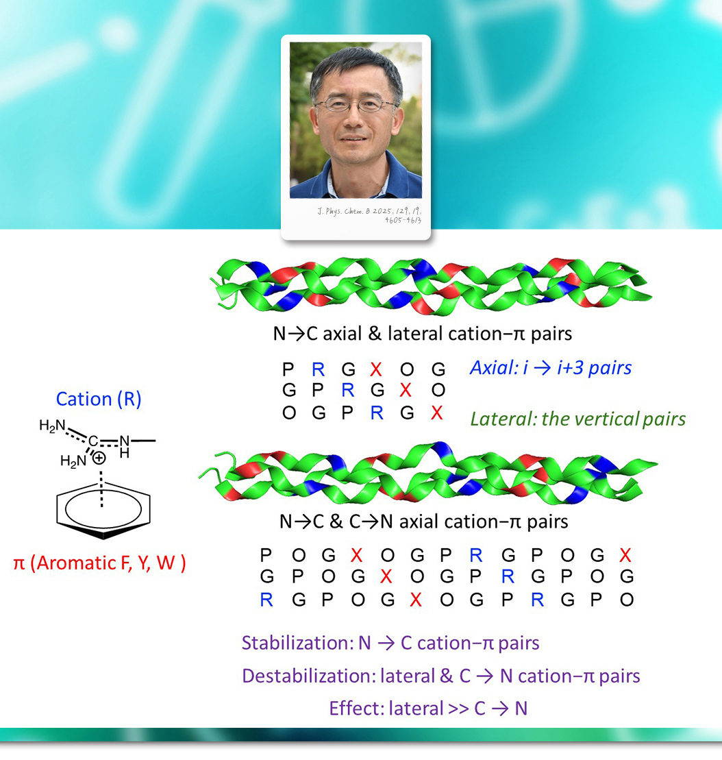 膠原蛋白由三股螺旋組成,為哺乳動物含量最多的蛋白質,一直都是熱門的生物材料。本實驗室致力於膠原蛋白胜肽設計,導入不同非共價作用力以探討其對膠原蛋白結構的影響。在膠原蛋白中,含有很多生理條件下帶正電的胺基酸如精胺酸(Arginine)和芳香族胺基酸如苯丙胺 酸(Phenylalanine),為了探討這些胺基酸在結構中所扮演的角色,本研究針對陽離子–π作用力進行探討。為了暸解陽離子與芳香基團之間的配對組合與相對位向對三股螺旋結構的影響,我們設計並合成一系列含有精胺酸與芳香族殘基的膠原蛋白模擬胜肽(collagen-mimetic peptides, CMPs),以檢視兩種類型的軸向陽離子–π配對(N→C 與 C→N方向)和側向陽離子–π配對的貢獻。研究結果顯示N→C 配對可顯著地穩定結構,而C→N 配對與側向配對則導致結構不穩定,其中側向配對有最強的不穩定效應。同時,我們設計包含不同側向與軸向陽離子–π配對的 CMPs,以探討這些配對在同源與異源三股螺旋中的耦合效應。我們發現以個別陽離子–π配對貢獻度所預測之熔化溫度,與同源三股螺旋的實驗值相當吻合。此外,藉由適當的序列安排與設計也發現,具較多 N→C 軸向配對的 CMPs 可形成較穩定的異源三股螺旋。本研究揭示了膠原蛋白三股螺旋中陽離子–π配對效應的重要特性,對於設計與開發膠原蛋白相關材料具有高度參考價值。