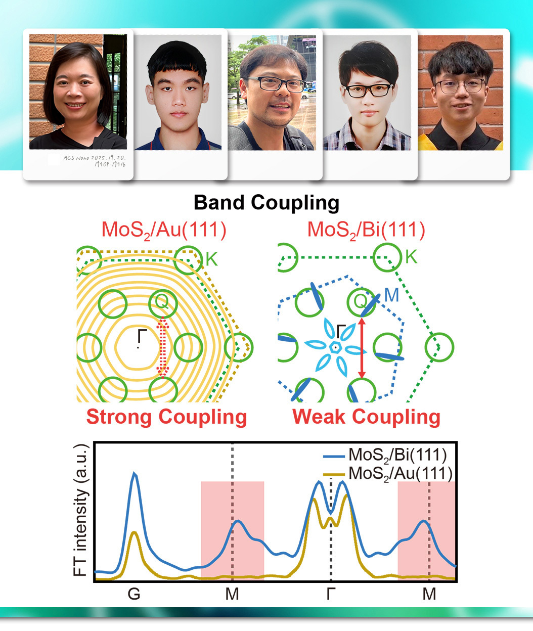 本工作以二硫化鉬(MoS2)為代表性二維半導體材料,並分別搭配具有強層間軌域耦合代表的金屬Au(111)及弱層間軌域耦合代表的半金屬Bi(111)基板,以STM/S捕捉介面能帶中金屬誘發能隙態(MIGS)衰減行為及能谷散射變化。研究成果發現,MoS2/Au(111)系統的金屬誘發能隙態(MIGS)分布涵蓋整個MoS2能隙,伴隨明顯的Q能谷結構破壞,顯示其具強烈層間耦合,從MoS2導帶(conduction band)最小值位置顯現出該系統具有約0.51 eV的蕭特基能障(Schottky barrier)導致高接觸電阻;MoS2/Bi(111)系統則呈現金屬誘發能隙態(MIGS)遠離MoS2導帶(conduction band)最小值且Q能谷結構完整、高載子濃度等特性,顯示弱層間耦合與能隙態飽和現象,有助於提升接觸電性表現,揭示金屬誘發能隙態(MIGS)與谷能帶調變對金屬/半導體接觸之電性效能關鍵影響,進一步理解半金屬如鉍(Bi)成為優異接觸材料的物理機制。此工作為優化二維半導體接觸機制提供嶄新視角,對未來二維材料元件設計具有重要意義。