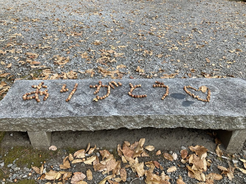 その最中、ふとベンチに目を向けると──クヌギのどんぐりで並べられた「ありがとう」の文字が。