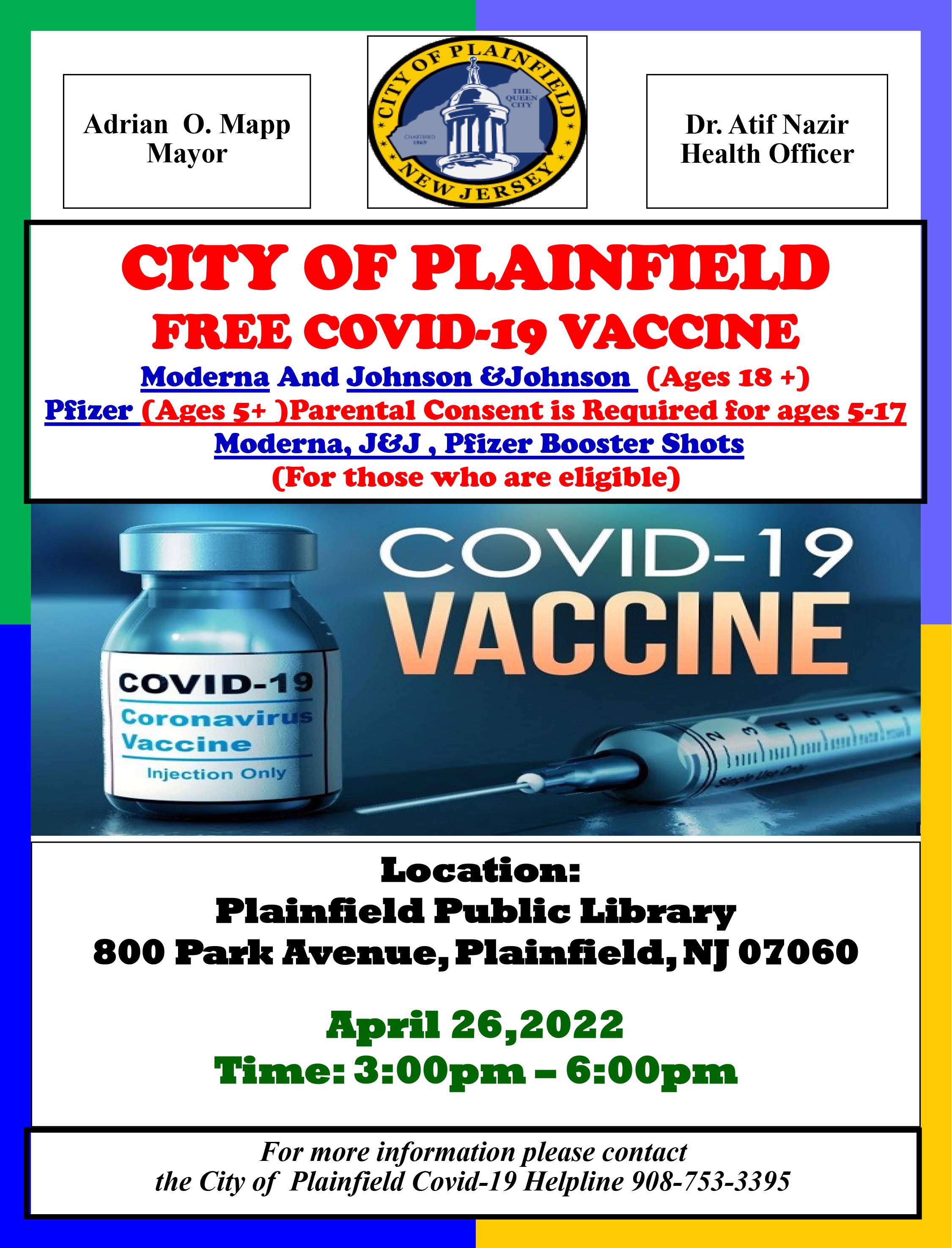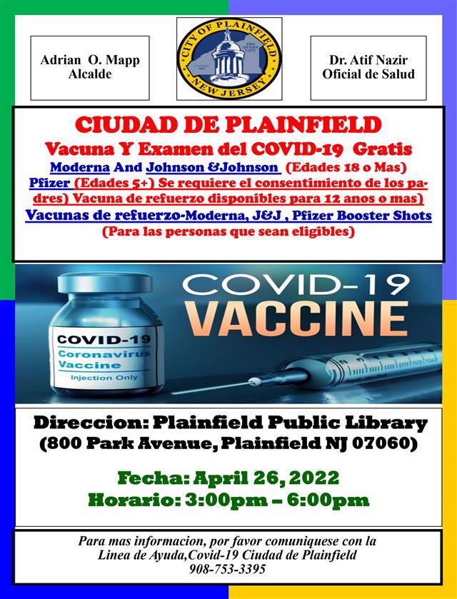 A full range of COVID vaccines and boosters will be available - free of charge - at the Plainfield Public Library on April 26th, downstairs in the Anne Louise Davis Room, from 3-6pm.