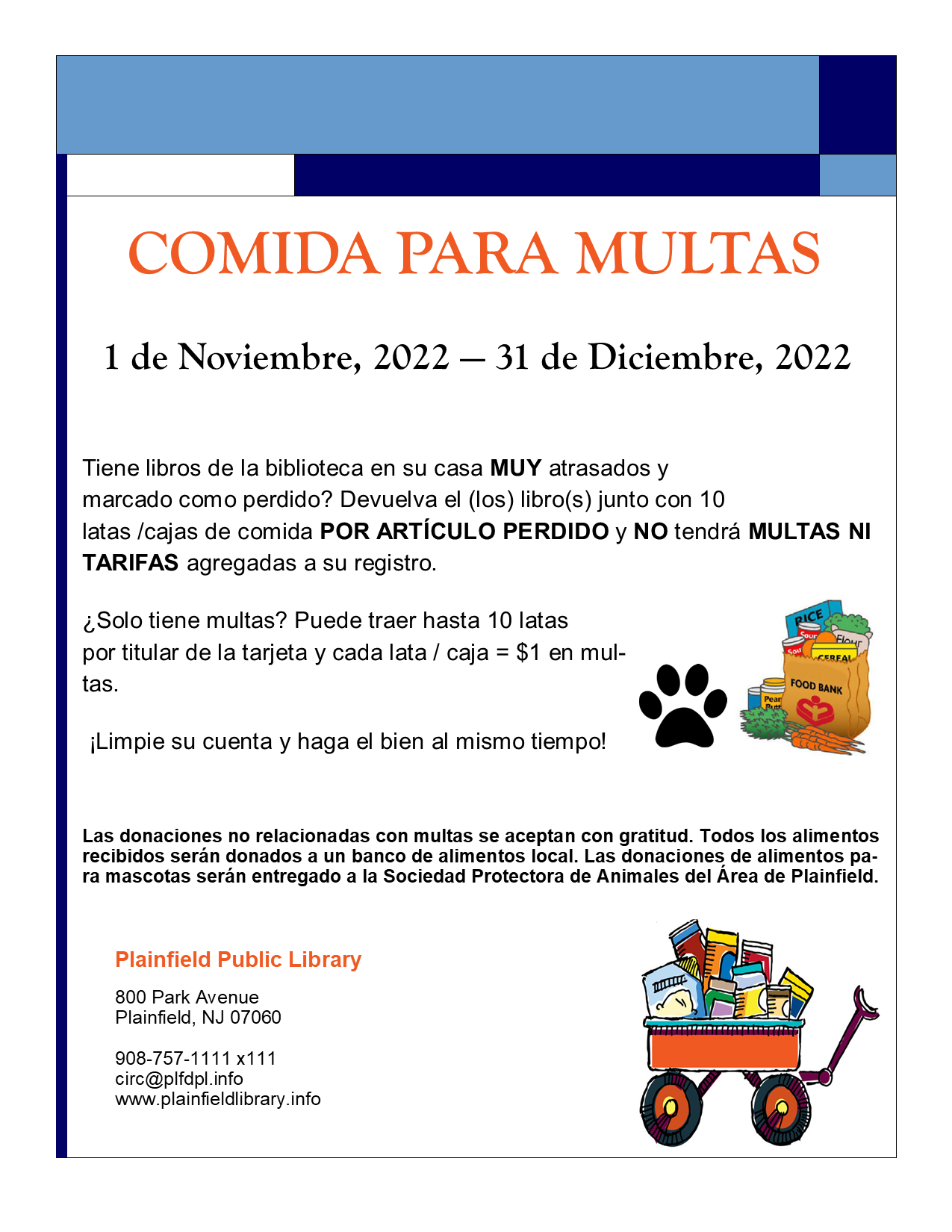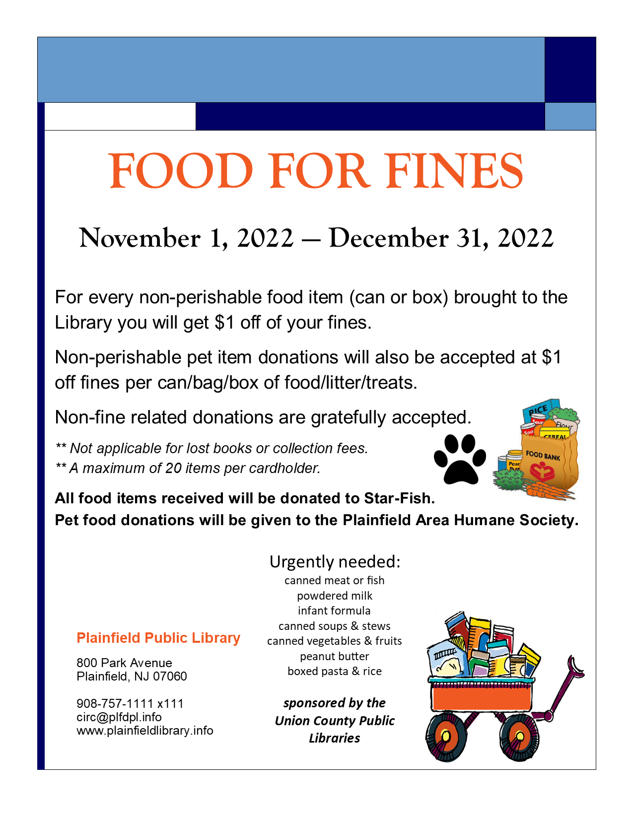 We are once again having our Food for Fines. By donating an item of groceries or pet food you can reduce your overdue fines by $1.00 for each item donated. All items collected will go to lStarFish and the Plainfield Humane Society. Think of giving during this most special season.