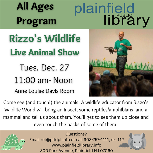 A Rizzo's Wildlife World educator will visit with a selection of creatures, and will give an introduction to what makes each one special. Come along and see the animals this holiday season!
