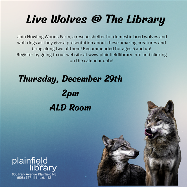 Howling Woods Farm is a rescue shelter for domestic-bred wolves and wolf dogs. They'll be here to tell us all about these amazing creatures, and we'll get to meet a pair of them. Join us on December 29th to catch much more than a glimpse of wolves at the Library.