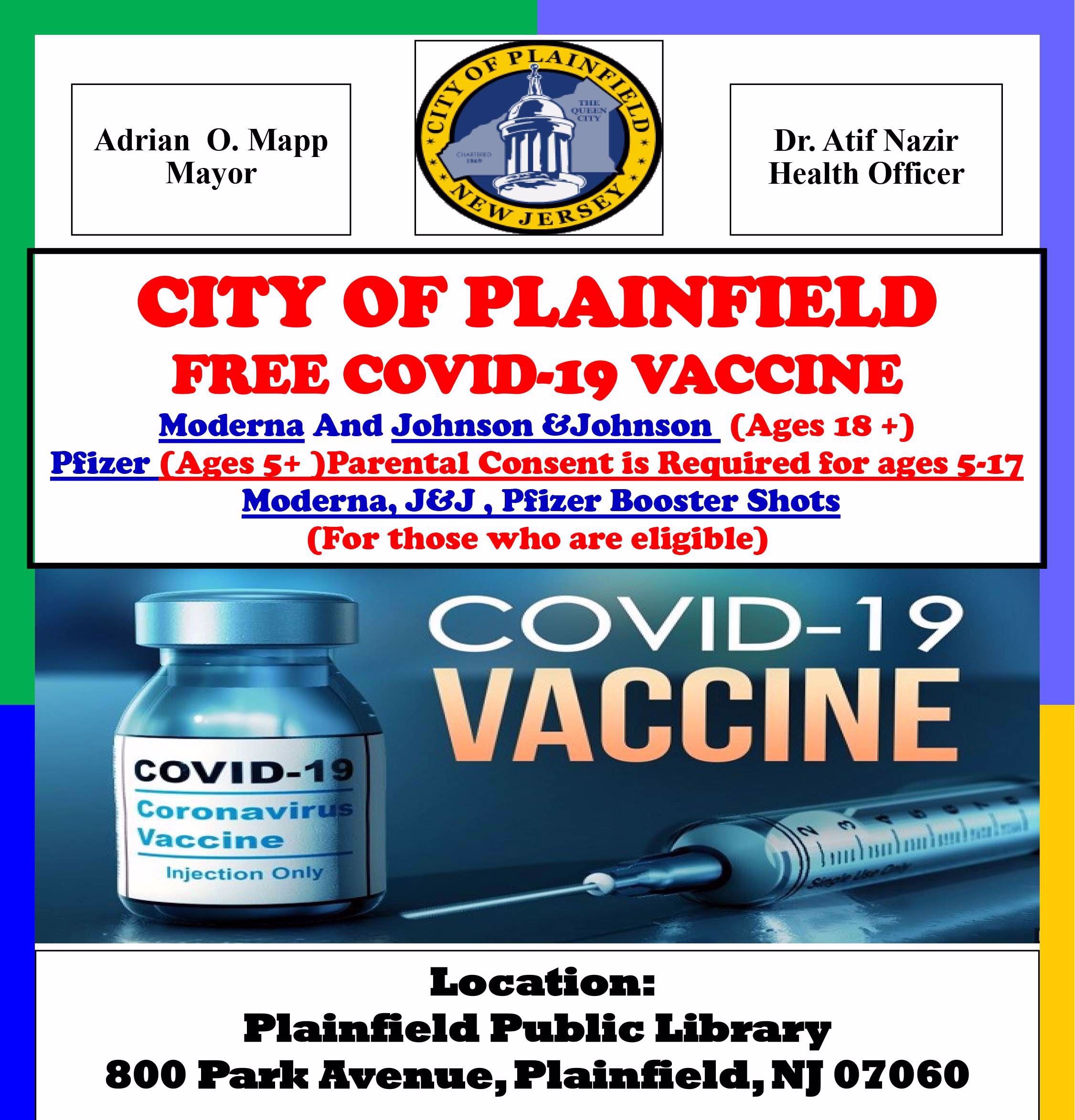 A full range of COVID vaccines and boosters will be available - free of charge - at the Plainfield Public Library on May 24th, downstairs in the Anne Louise Davis Room, from 4-7pm. ( see Calendar event)