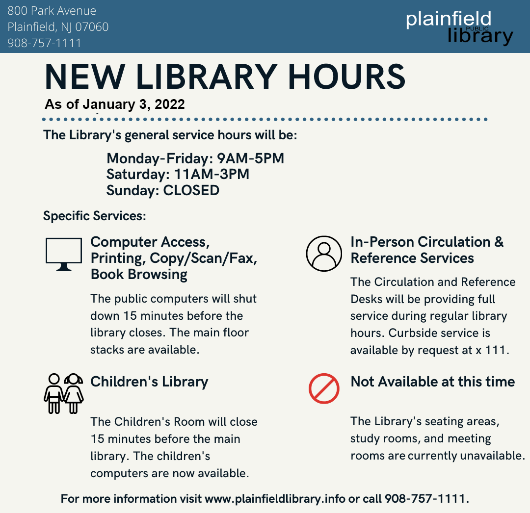 This temporary change in hours should allow the Library some flexibiity to maintain staffing levels during current Covid-19 conditions. The change in hours should not affect the range of currently available services.