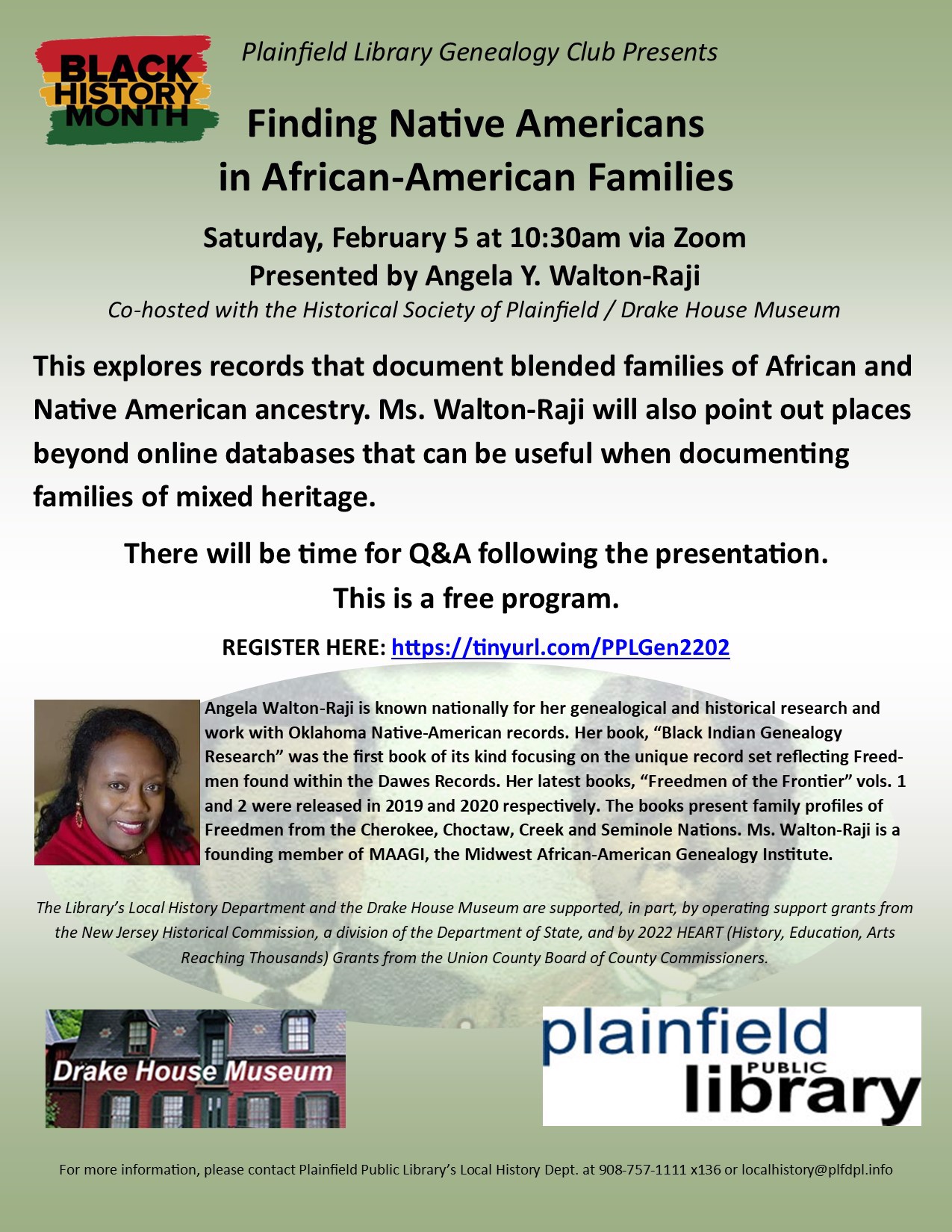 The Plainfield Room is open by appointment for historical and genealogical research. We are celebrating Black History Month with two informative & interesting virtual programs. Also, the Memoir Writing Club will meet, via Zoom, on February 9th; the optional writing topic is "Your first boss". New members are welcome!