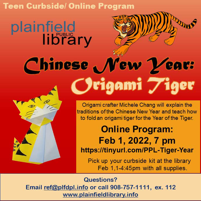 Teen Craft: It’s the beginning of the Year of the Tiger, so join Origami expert Michele Chang to hear about the celebration of the Chinese New Year and learn to fold an origami Tiger!