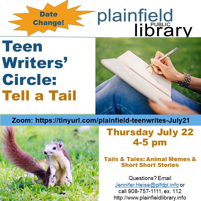 Plainfield Public Library is starting a Teen Writers’ group for people ages 11-18! We will be meeting via Zoom on Thursday July 22nd at 4 pm. https://tinyurl.com/plainfield-teenwrites-July21