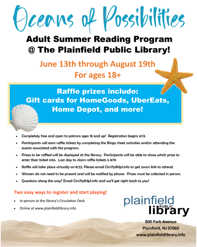 Adult programs (ages 18+) includes a fun Reading Bingo activity to do on your own time, rewards, special craft programs, and gift card raffles to HomeGoods, UberEats, Home Depot, and more! Adult program Schedule.