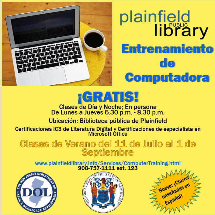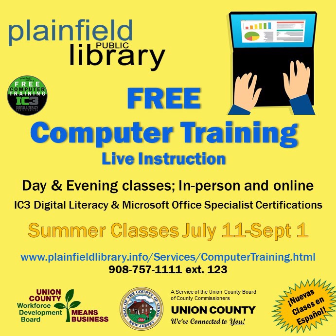 Plainfield Library Digital Literacy is also offering an in-person evening course with Spanish-speaking instructors. This course will cover the IC3 Digital Literacy curriculum, including computer fundamentals, introduction to Microsoft Office, and skills for living in an online world. Classes will run Monday-Thursday evenings for 8 weeks.