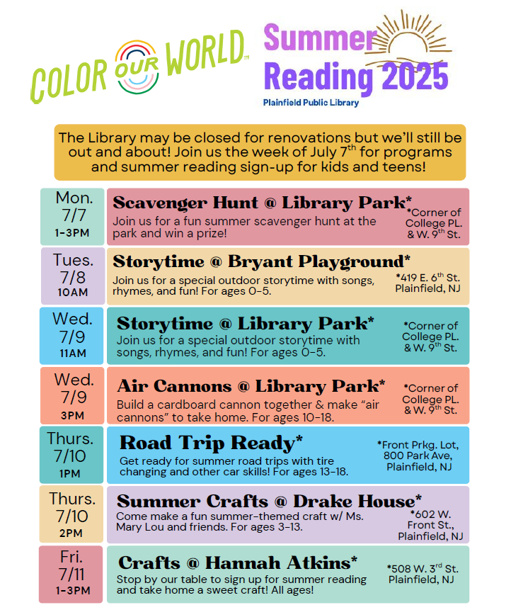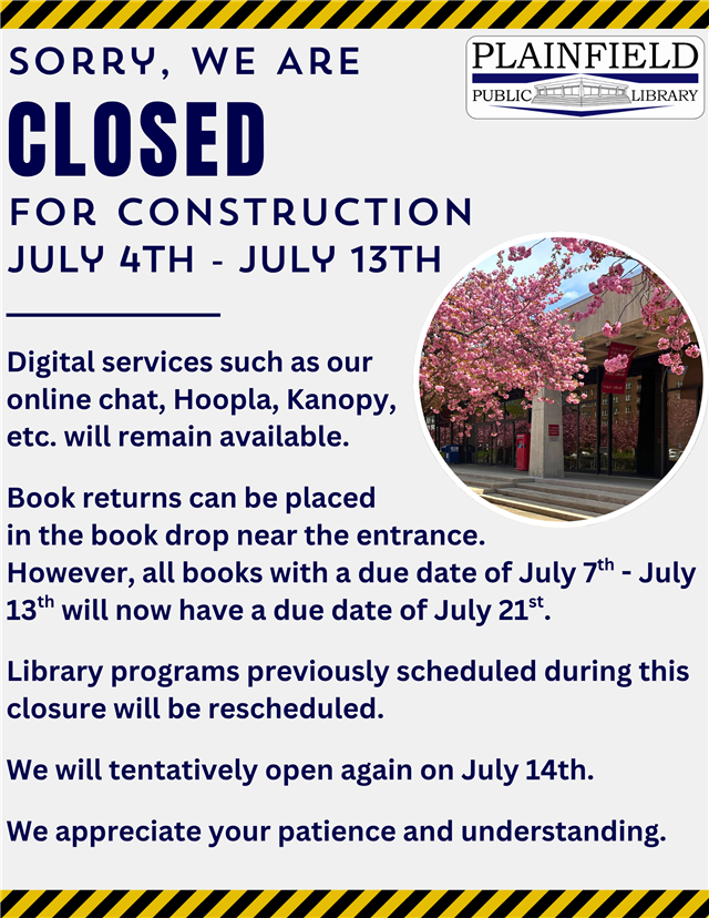 We will be closed from July 4th to July 12th for construction. Programs previously scheduled during this closure will not be hosted in our Children's library. Instead, we'll be out and about exploring new locations all over Plainfield!