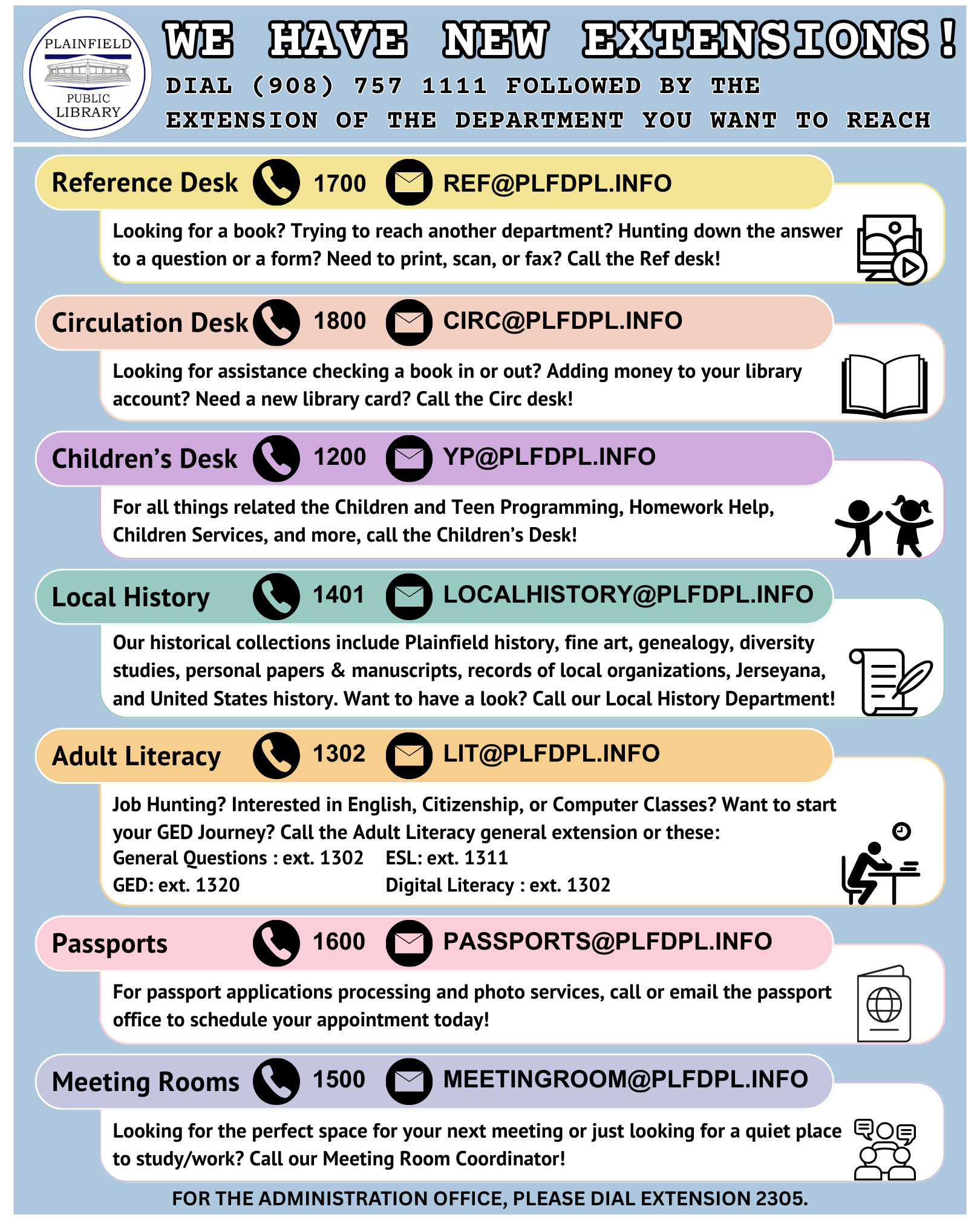 For department-specific information, you can contact the relevant departments at their new extension numbers: