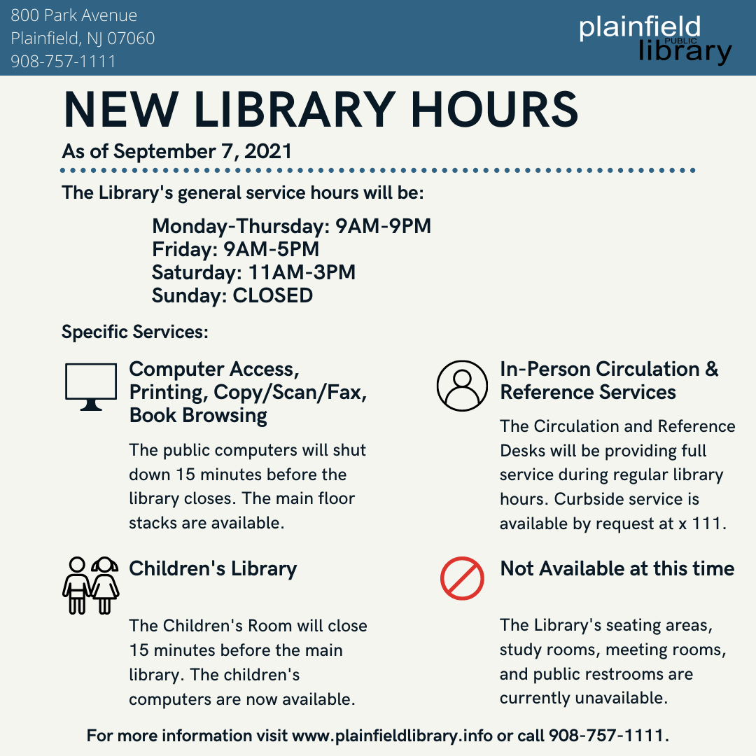 Please refer to http://www.plainfieldlibrary.info/Services/InPersonService.html for full details of currently-available, in-person services and additional information.