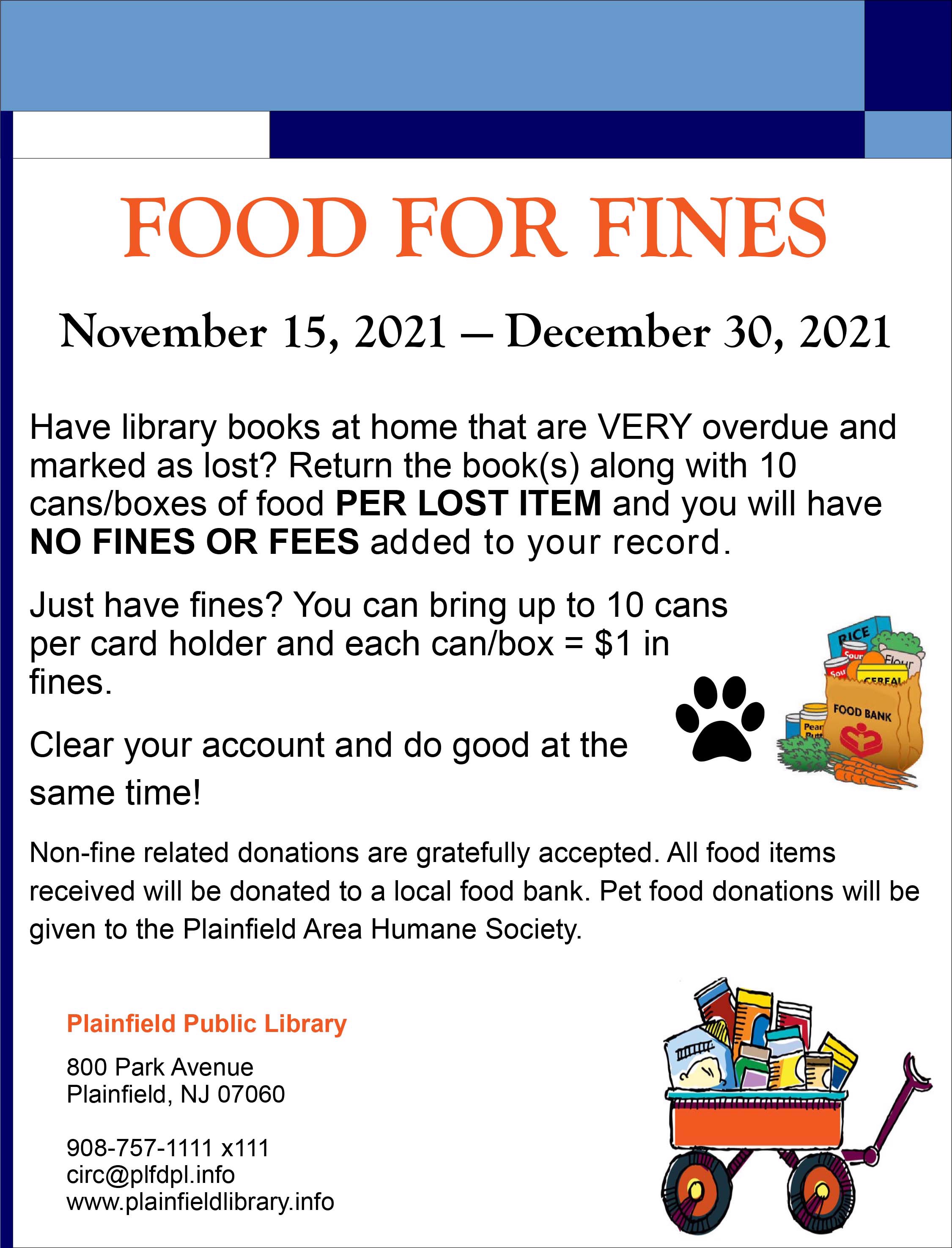 Non-fine related donations are gratefully accepted. All food items received will be donated to a local food bank. Pet food donations will be given to the Plainfield Area Humane Society.