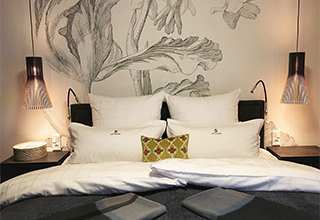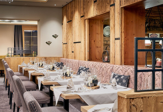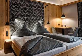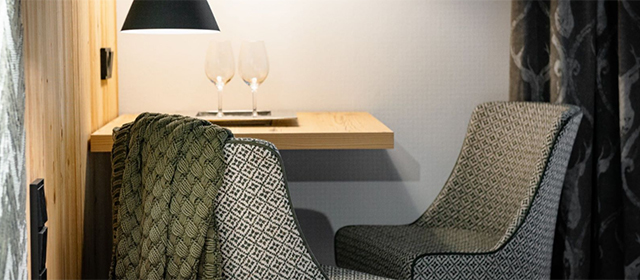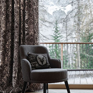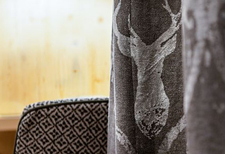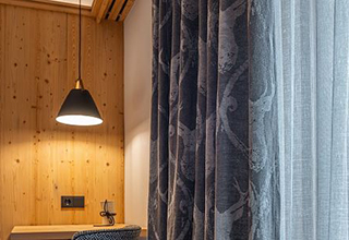 インテリアは「くつろぎ」をテーマにしており、生地は柔らかくて触り心地がよいものを選んでいます。ゲストが部屋に入ると、すぐにくつろげる雰囲気が広がります。生地は、使用されている木材やその他の天然素材と見事に調和しています。壁面にも生地を用いることで、さらに心地よい空間を作り出しています。また、施設のシンボルであるバラのモチーフを随所に取り入れ、自然に溶け込むようなデザインに仕上げています。選ばれた色合いは温かみがあり、ローゼンアルプの快適な雰囲気と特別な印象に素晴らしくマッチしています。 |