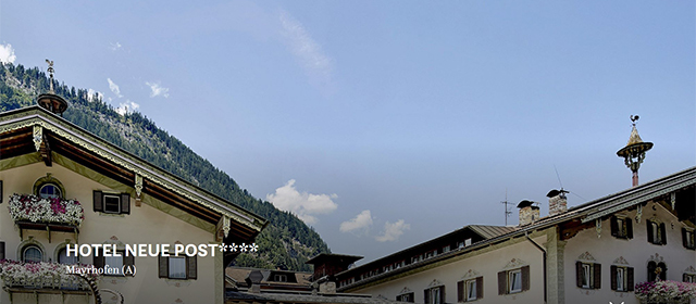 オーストリア南部のマイヤーホーフェンは、山の素晴らしい景色、アルプスの独特な気候とチロル地方の魅力あふれる村で、登山やハイキング、サイクリング、スキーなどのアクティビティが人気です。ホテル・ノイエ・ポストは、村の中心部に位置し、花で飾られ、素朴な鐘楼とファサードに壁画があるツィラータール渓谷の典型的な建物で、「おもてなし」に誇りを持っています。 |