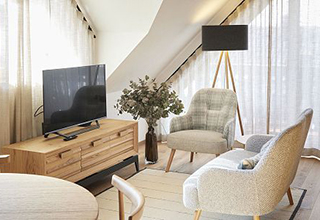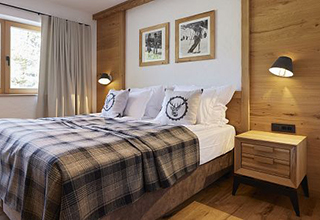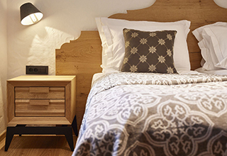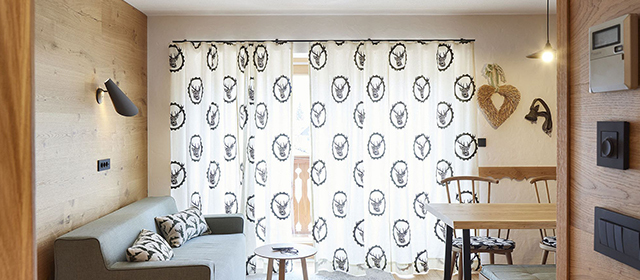 古い木材と多様な生地。この二つの要素がアパートの雰囲気を根底から支えています。ヘッドボードに用いた山の頂をイメージした生地のように、視覚的に魅力あるデザインのテキスタイルを中心に据えて、独特な模様や大小の柄を組み合わせることで、雰囲気のあるスタイルを造りました。モダンな要素と伝統的な要素が無理なく融合し、山岳リゾートを訪れる人々の現代的なライフスタイルにぴったりと寄り添います。