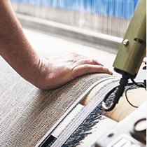 ビニール糸をそれぞれタテ糸・ヨコ糸として使い、織機で織り上げ、織りあがったシート状の織物に床材としての用途に耐えるようバッキングを施します。