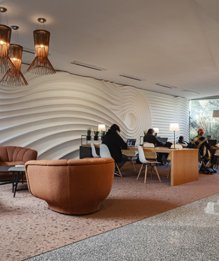 騒がしい空間は、生産性の低下やストレスにつながります。Ntgrate社では、「織り」という構造だけに頼らず、吸音性の高いフェルトバッキングの採用などを通して、音響性の改善に役立つ商品づくりに力を入れています。