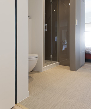 防水性について。床材表面は防水性がありますが、床材の継ぎ目は透水の可能性があります。完全な防水性が必要な場所への設置の際は継ぎ目の処置が必要となります。