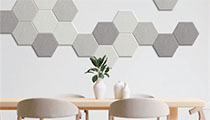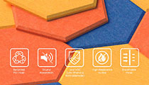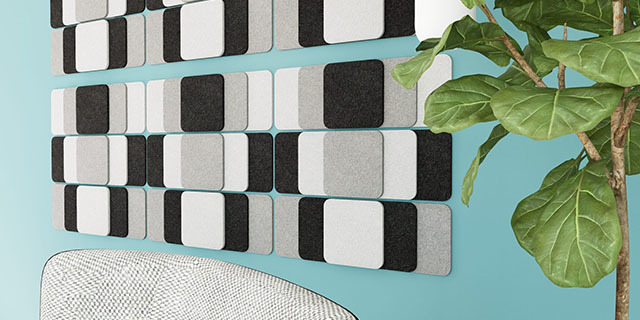 ポリエステル製の小さなタイル状のピースを組み合わせ、壁などにシールのように自由に貼り付けることができ、手軽に吸音効果を得ることができます。厚さは9mmと12mm、標準色は14色。とても軽く硬質で、吸音性能も本格的。素材のポリエステルは再生材料で、環境にも配慮されています。