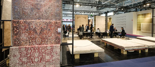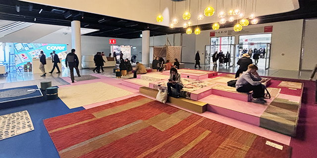高品質な手織りカーペットから機械織りカーペット、繊維や糸、カーペット専用のテクノロジー関連の出店まで、幅広い出展者が集まり、ホール5を中心とする展示エリアは3倍以上の規模に拡大しました。ホール 5.1 / 6.1 のホワイエには、カーペット・ラウンジが展開され、ハイライト展示でPRが行われていました。