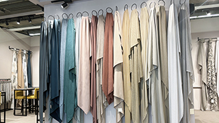織りに工夫を加えたテクスチャー感のある無地、ナチュラルカラー、エコ&サステナブルといった、昨年からの流れは続いています。ブラウンカラーやブークレー生地の人気も続いているようです。また、暗幕やアコースティック性といった機能を謳ったカーテン地も充実してきているようです。