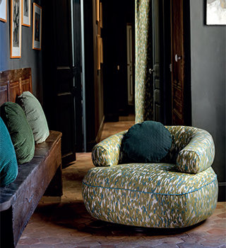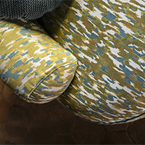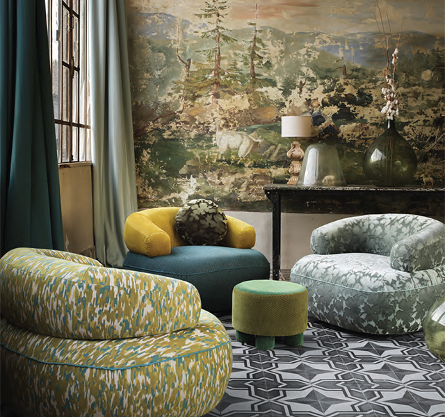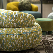 小柄で構成された生地は、一見すると無地のように見えますが、単色無地には出すことのできない深みが表れます。「フェイクプレーン」と呼ばれるこうした生地は、使われる色の組み合わせが複雑で意外性があればあるほど空間に面白さと新しさを与えます。