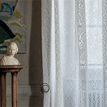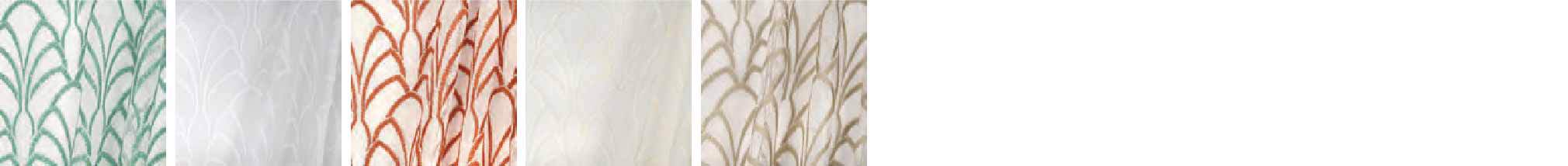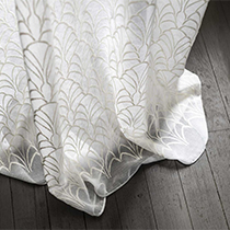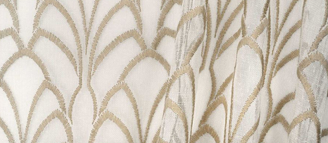 シアーカーテン地「URANIA」は、薄く透明感のある生地に刺繍が施されています。アールデコを彷彿とさせる連続模様ですが、モチーフとなっているのは「貝」で、ボッティチェリの「ヴィーナスの誕生」にインスパイアを受けたのだとか。モチーフの再解釈も、クラシックとモダンをつなぐ一つの手法となっています。
