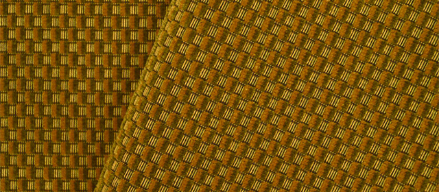 フェイクプレーン・ベルベットの「 AURA」 は、地の織りとベルベットを格子のように組み合わせて立体感を出しています、地織りの部分は縞のように色糸を配し、ベルベットの部分も2色のパイルで構成されています。明るい色とトーンを下げた深みのある色を組み合わせることにより、レリーフのように浮き出て見える効果を狙っています。