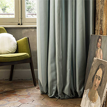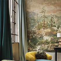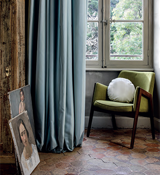シンプルですが、セレクトされた色もソフトで絶妙です。コレクションカバーでは、裾をたっぷりと垂らし、左右に違う色のカーテンが掛けられています。「陰影」は、新旧折衷スタイルの一つのキーワードとなっているようです。 |