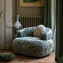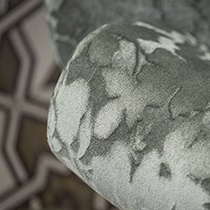 柄にほんのりと光沢があり、リーフ柄がシルエットのように浮き出して見える「SANDRO」は、手触りの滑らかなジャガード・ベルベット。光と影の相互作用により、見る角度によって色やパターンが変化しているように見えます。
