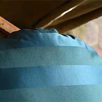 「SILLAGE」は、光沢と質感によって縞を表現しています。サテン織りによって光沢部分をつくりマットな部分と対比させています。単色糸を使用しているため柄がリバーシブルになっており、翻っても美しく流れるような効果を生み出しています。