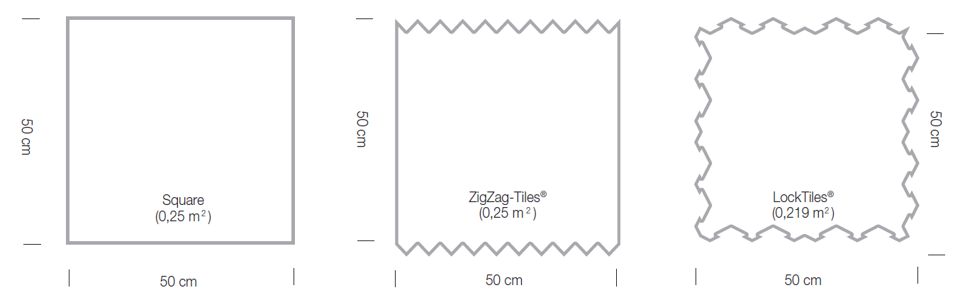 原理は簡単です。ピースの形をギザギザにすることで、ほとんど継ぎ目の目立たないタイルカーペットが実現しました。特許技術でレーザーカットされたエッジ同志は、ほつれることなくぴったりと適合し、またどの方向からもかみ合う形に設計されています。ピースの形は3種類の中から選べます。