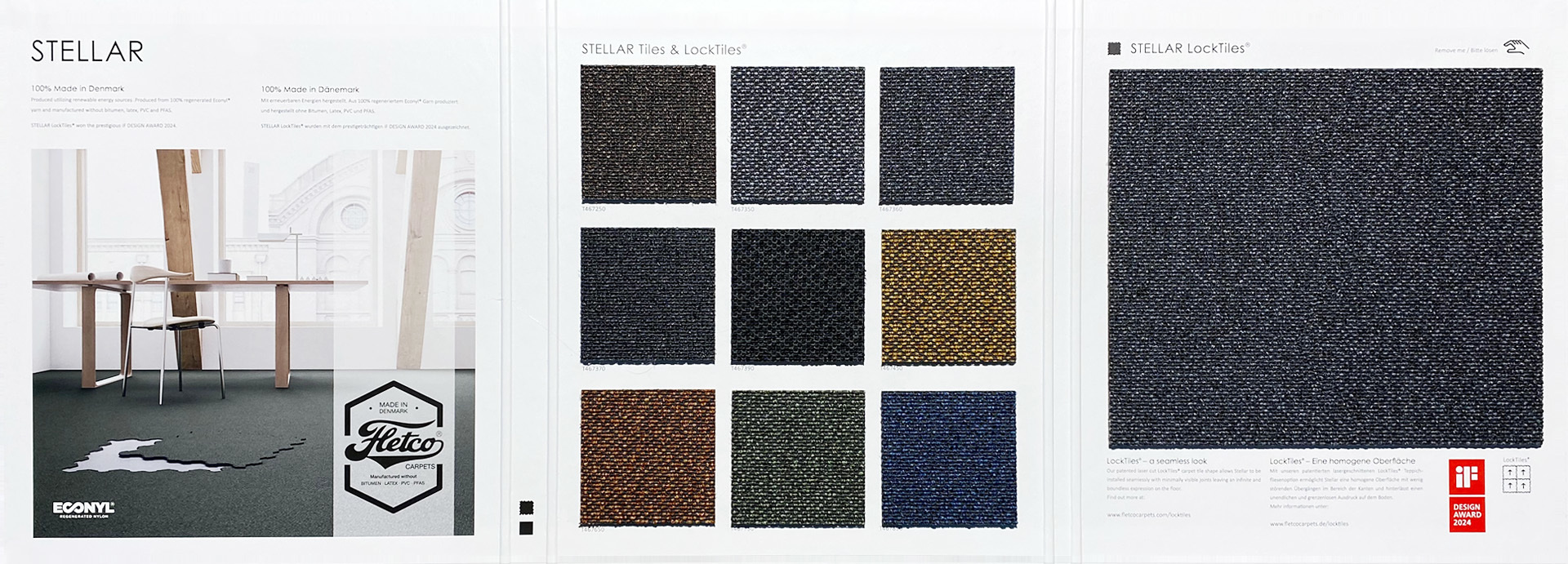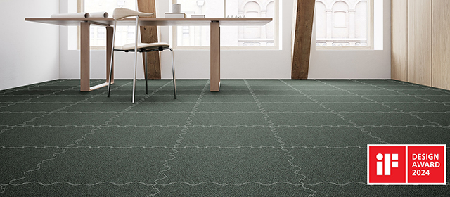 ベースとなるカーペットは密度が高くやわらかな風合いの平織りで、糸はリサイクルナイロン「ECONYL」を使用しています。シンプルな北欧スタイルにマッチするダークカラーを採用し表情はとてもエレガント。同コレクションの「STELLAR LockTiles®」は、IFデザインアワード2024を受賞しています。