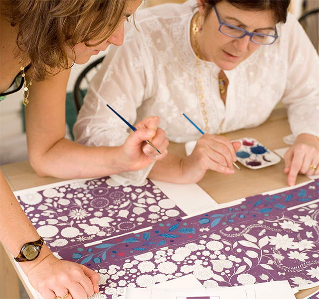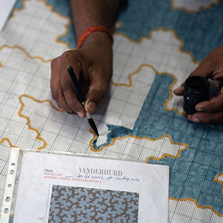 クリスティンは、インディアの描いた絵を、パターン・リピートが無い流れるような、そしてオリジナリティあふれるデザインに落とし込みました。柄の繰り返しがないため、どの位置にいても異なる柄が目に入ります。全体的なトーンは統一されていますが、遊び心に満ちたデザインとなっています。