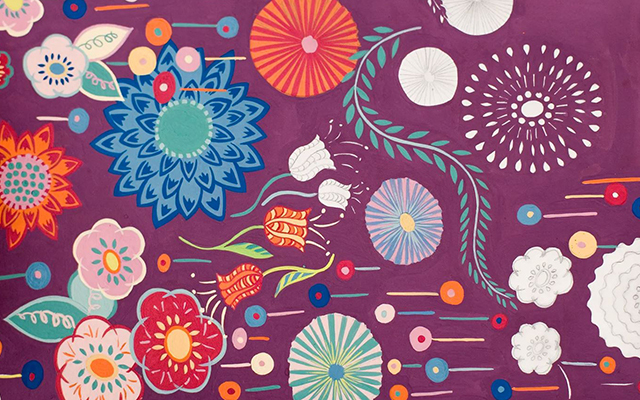 クリスティンは、普段からガッシュを使用しています。「色は感情であり、私にとって色がうまく機能することは非常に重要です」とクリスティンは述べています。よく見ると葉や茎、花のモチーフを縁取るラインにもそれぞれ異なる色が配置されており、複雑なパターンを形成しています。色による効果が慎重に考えられ、最大限に活かされていることが感じられます。