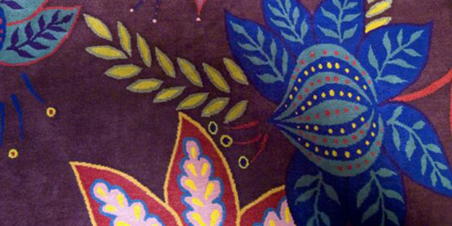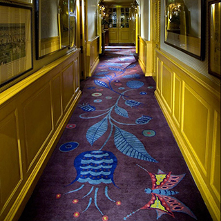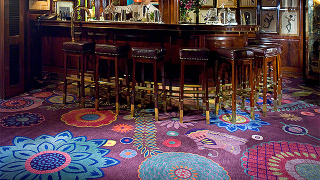 カーペットの新しい制作に際し、オーナーの娘であるインディアの水彩画がデザインの出発点となりました。このアイデアとモチーフをクラブの複数の部屋に反映させることが、テキスタイルデザイナーのクリスティンへの依頼でした。