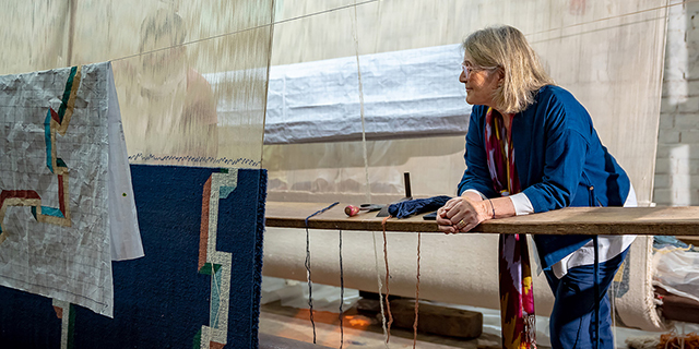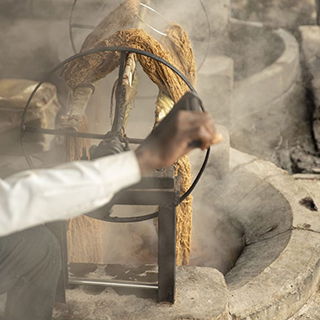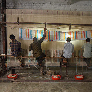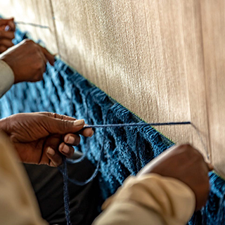 タテ糸をしっかりと張り、人の手で色糸を一つずつ結びながら織り進めます。デザインが非常に複雑なため、一日に5センチ程度しか織り進めることができず、製造は6ヶ月以上を要しました。