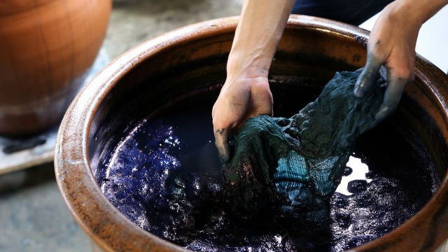 藍の色素は不溶性で、他の染料植物と同じように煮ても色素は取り出すことができません。そこで、藍を甕に入れて発酵させ藍液を作ります。この作業を「建てる」といいます。こうしてできた藍液に糸や生地を浸しその後空気にさらすと、直後は黄土色となり、徐々に酸化して青に発色していきます。