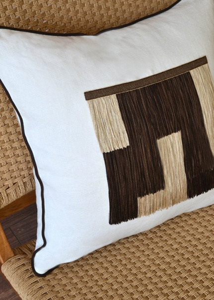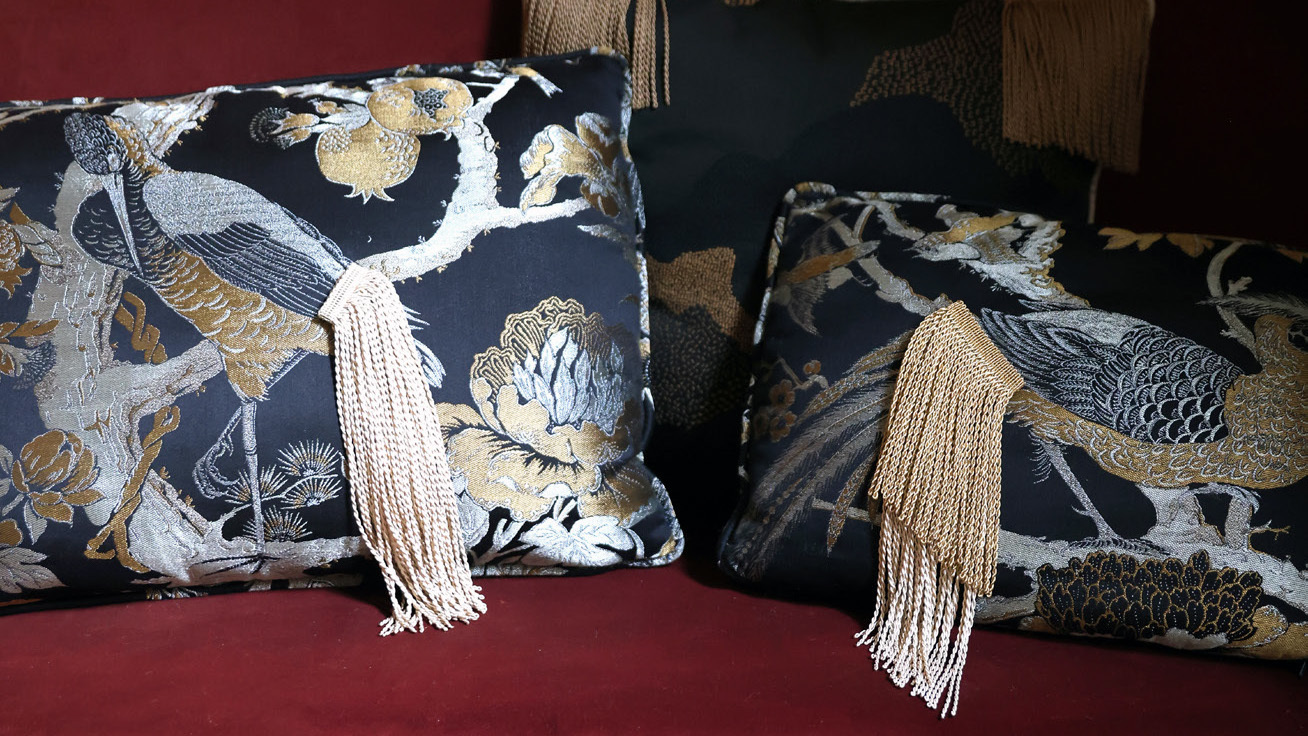 ブリオン・フリンジは、光沢を帯びた生地にぴったり。上の写真では、織りこまれた鳥のデザインの尾の部分にフリンジを取り付けています。優雅で遊び心のある印象的なクッションになりました。